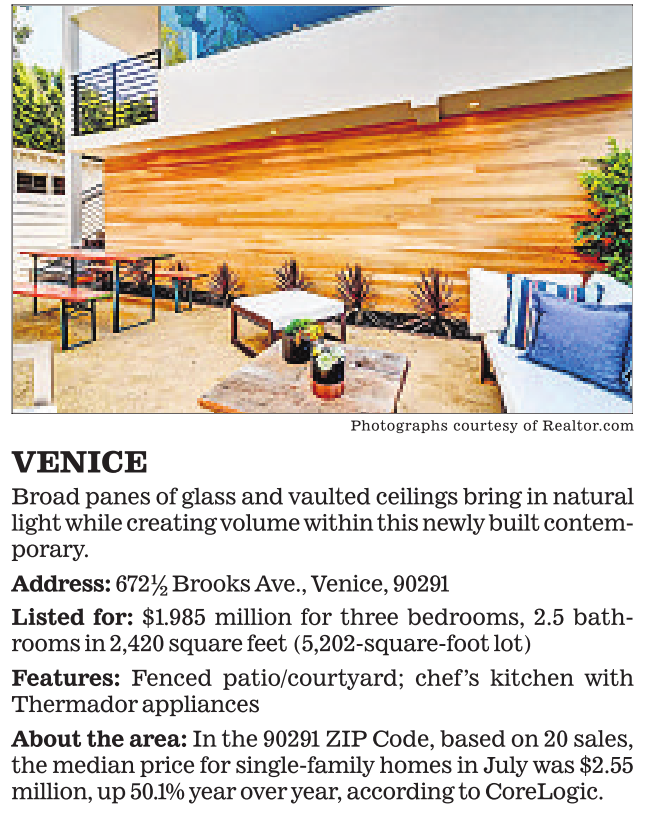 About the area: In the 90291 ZIP Code, based on 20 sales, the median price for single-family homes in July was $2.55 million, up 50.1% year over year, according to CoreLogic.