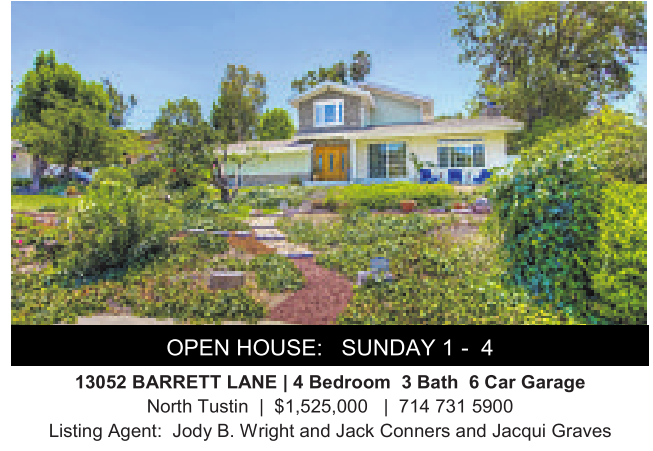 OPEN HOUSE: SUNDAY 1 - 4 13052 BARRETT LANE |4Bedroom 3Bath 6 Car Garage North Tustin | $1,525,000 | 714 731 5900 Listing Agent: Jody B.Wright and Jack Conners and Jacqui Graves