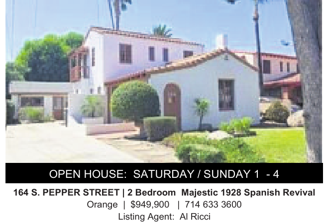 OPEN HOUSE: SATURDAY / SUNDAY 1 - 4 164 S. PEPPER STREET |2Bedroom Majestic 1928 Spanish Revival Orange | $949,900 | 714 633 3600 Listing Agent: AlRicci
