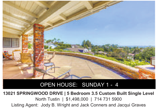 OPEN HOUSE: SUNDAY 1 - 4 13021 SPRINGWOOD DRIVE |5Bedroom 3.5 Custom Built Single Level North Tustin | $1,498,000 | 714 731 5900 Listing Agent: Jody B.Wright and Jack Conners and Jacqui Graves