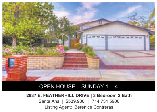 OPEN HOUSE: SUNDAY 1 - 4 2837 E.FEATHERHILL DRIVE |3Bedroom 2Bath Santa Ana | $539,900 | 714 731 5900 Listing Agent: Berenice Contreras