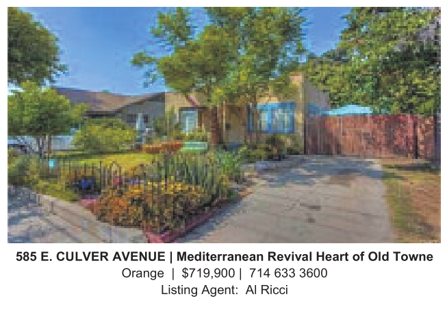 585 E.CULVER AVENUE |Mediterranean Revival Heart of Old Towne Orange | $719,900 | 714 633 3600 Listing Agent: AlRicci