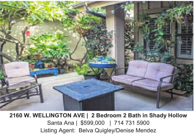 2160 W.WELLINGTON AVE | 2 Bedroom 2Bath in Shady Hollow Santa Ana | $599,000 | 714 731 5900 Listing Agent: Belva Quigley/Denise Mendez