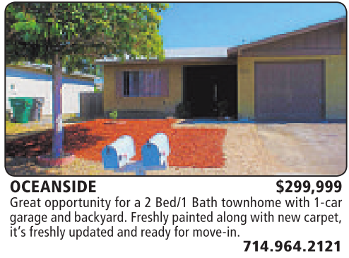 OCEANSIDE $299,999 Great opportunity for a2Bed/1 Bath townhome with 1-car garage andbackyard. Freshlypainted along with newcarpet,