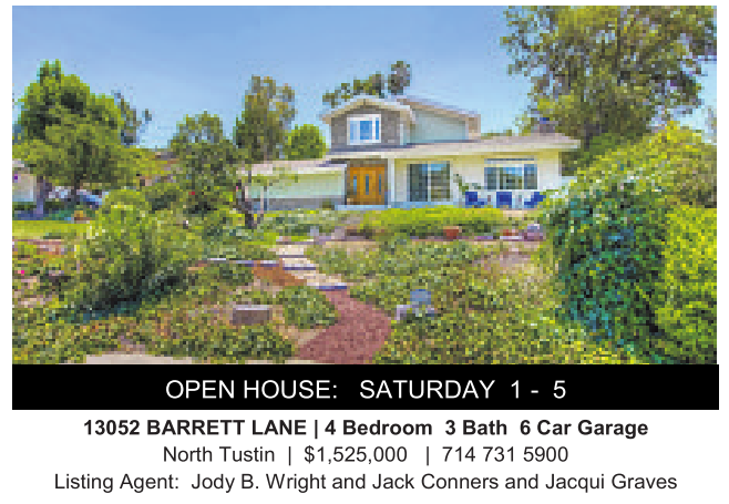 OPEN HOUSE: SATURDAY 1 - 5 13052 BARRETT LANE |4Bedroom 3 Bath 6Car Garage North Tustin | $1,525,000 | 714 731 5900 Listing Agent: Jody B.Wright and Jack Conners and Jacqui Graves