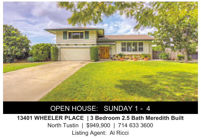 OPEN HOUSE: SUNDAY 1 - 4 13401 WHEELER PLACE |3Bedroom 2.5 Bath Meredith Built North Tustin | $949,900 | 714 633 3600 Listing Agent: AlRicci