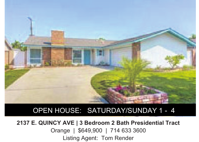 OPEN HOUSE: SATURDAY/SUNDAY 1 - 4 2137 E.QUINCY AVE |3Bedroom 2 Bath Presidential Tract Orange | $649,900 | 714 633 3600 Listing Agent: Tom Render