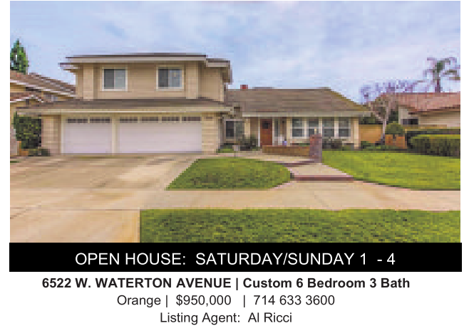 OPEN HOUSE: SATURDAY/SUNDAY 1 - 4 6522 W.WATERTON AVENUE |Custom 6Bedroom 3Bath Orange | $950,000 | 714 633 3600 Listing Agent: AlRicci