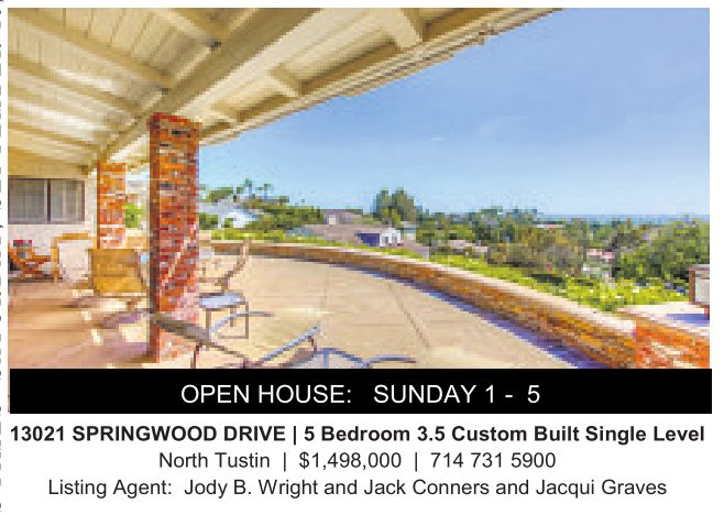 OPEN HOUSE: SUNDAY 1 - 5 13021 SPRINGWOOD DRIVE |5Bedroom 3.5 Custom Built Single Level North Tustin | $1,498,000 | 714 731 5900 Listing Agent: Jody B.Wright and Jack Conners and Jacqui Graves
