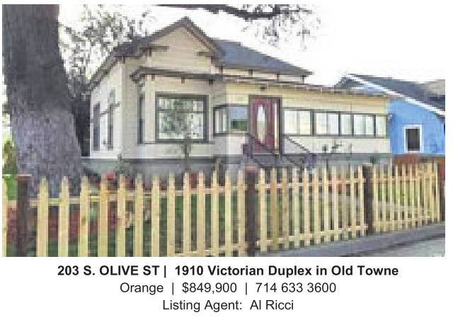 203 S. OLIVE ST| 1910 Victorian Duplex inOld Towne Orange | $849,900 | 714 633 3600 Listing Agent: AlRicci