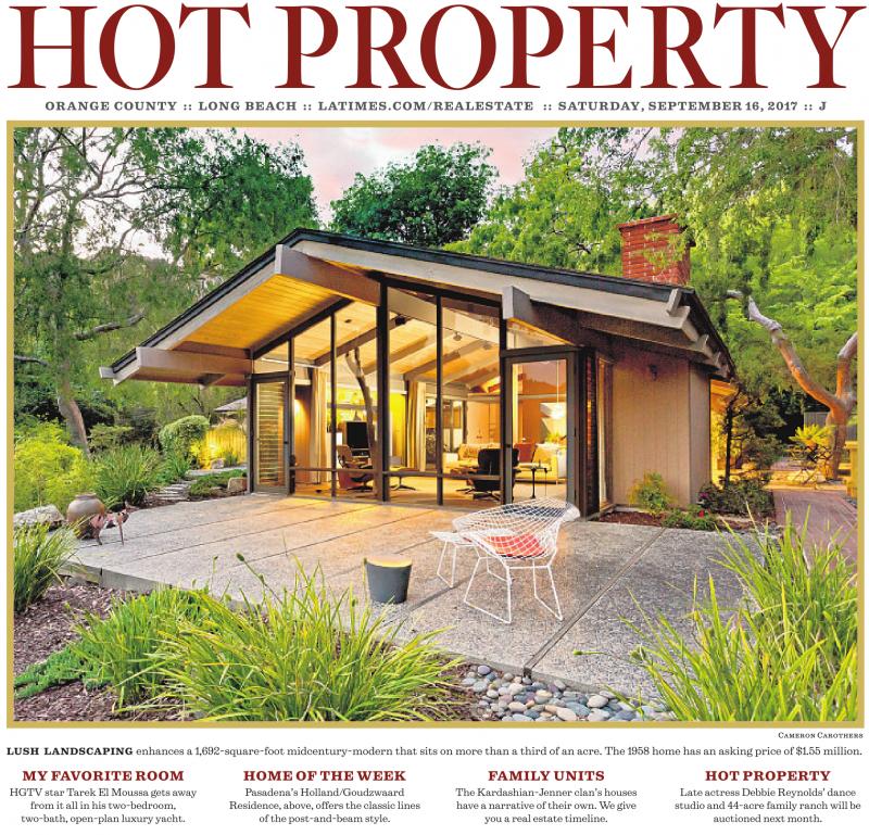 HOT PROPERT Y ORANGE COUNTY :: LONG BEACH :: LATIMES.COM/REALESTATE :: SATURDAY, SEPTEMBER 16, 2017 :: J Cameron Carothers LUSH LANDSCAPING enhances a 1,692-square-foot midcentury-modern that sits on more than a third of an acre. The 1958 home has an asking price of $1.55 million. MY FAVORITE ROOM HGTV star Tarek El Moussa gets away from it all in his two-bedroom, two-bath, open-plan luxury yacht. HOME OF THE WEEK Pasadena’s Holland/Goudzwaard Residence, above, offers the classic lines of the post-and-beam style. FAMILY UNITS The Kardashian-Jenner clan’s houses have a narrative of their own. We give you a real estate timeline. HOT PROPERTY Late actress Debbie Reynolds’ dance studio and 44-acre family ranch will be auctioned next month.