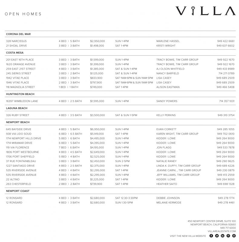201 EAST 16TH PLACE 3 BED | 3 BATH $1,599,000 SUN 1-4PM TRACY BOWIE, TIM CARR GROUP 949 922 1670 1620 ORANGE AVENUE 3 BED | 3 BATH $1,399,000 SUN 1-4PM TRACY BOWIE, TIM CARR GROUP 949 922 1670 259 EAST 21ST STREET 4 BED | 3 BATH $1,385,000 SAT & SUN 1-4PM AJ OLSON WHITFIELD 949 433 8989 245 SIERKS STREET 3 BED | 2 BATH $1,125,000 SAT & SUN 1-4PM NANCY BARFIELD 714 271 0789 1942 VITAE PLACE 3 BED | 3 BATH $833,900 SAT 11AM-6PM & SUN 11AM-5PM LISA CASEY 949 689 2509 1946 VITAE PLACE 2 BED | 3 BATH $797,900 SAT 11AM-6PM & SUN 11AM-5PM LISA CASEY 949 689 2509 118 MAGNOLIA STREET 1 BED | 1 BATH $749,000 SAT 1-4PM ALISON EASTMAN 949 466 5408