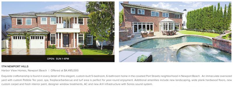 OPEN: SUN 1-4PM 1714 NEWPORT HILLS Harbor View Homes, Newport Beach | Offered at $4,495,000 Exquisite craftsmanship is found in every detail of this elegant, custom-built 5-bedroom, 6-bathroom home in the coveted Port Streets neighborhood in Newport Beach. An immaculate oversized yard with custom Pebble Tec pool, spa, fireplace/barbecue and turf area is perfect for year-round enjoyment. Additional amenities include new landscaping, wide plank hardwood floors, new custom carpet and fresh interior paint, designer window treatments, AC and new A/V infrastructure with Sonos sound system. See also