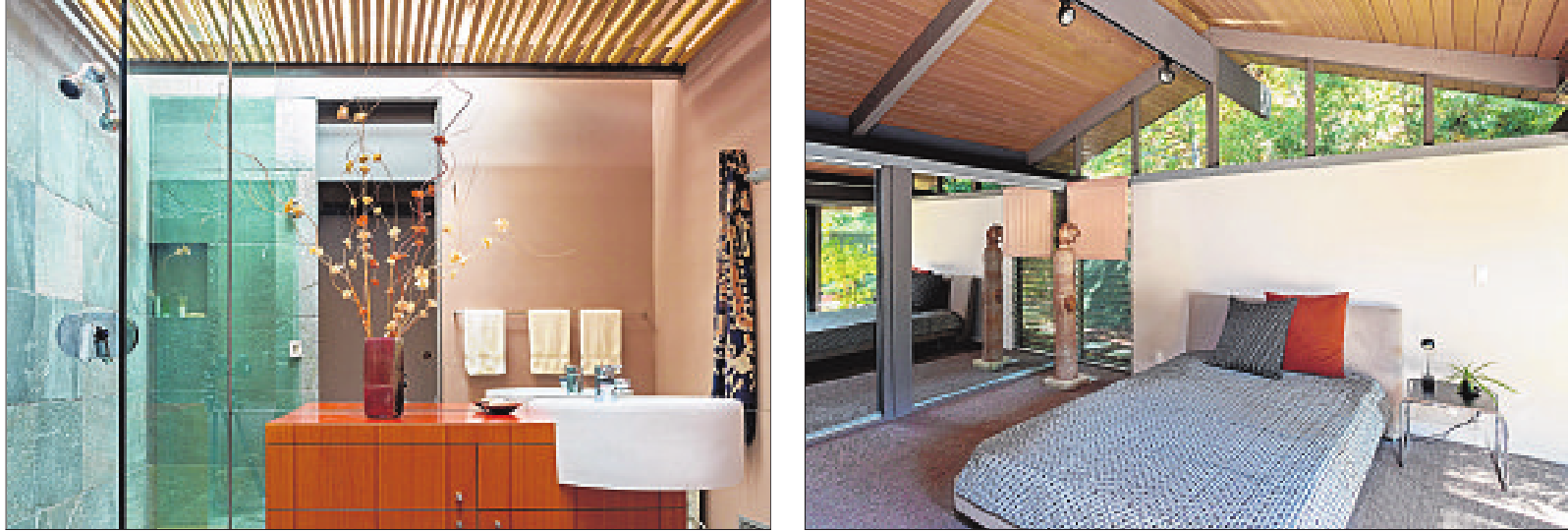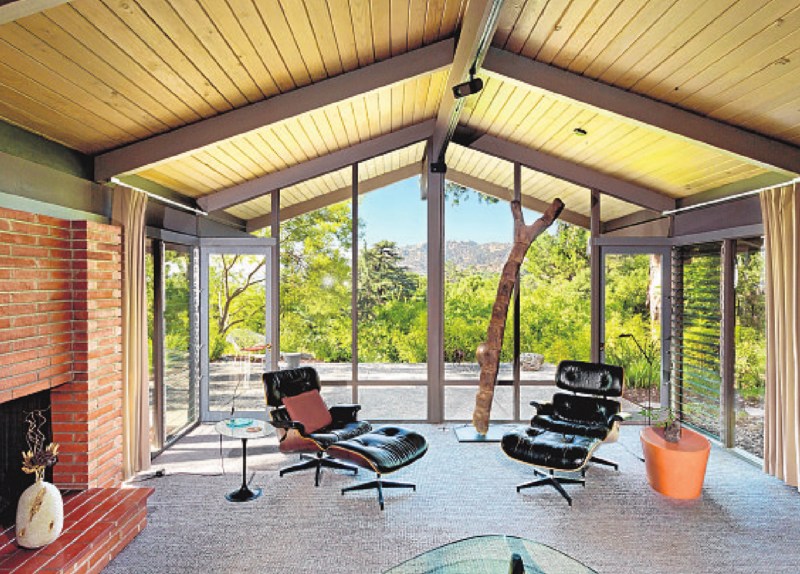 The Holland/Goudzwaard Residence, built in 1958, remains a stellar example of the post-andbeam style popularized after World War II. Walls of windows in the main living area bring in the lush landscapes and mountain ridges that surround the Pasadena residence. Updates by architectural interior designer Bob Moore present little deviation from the original footprint of the Calvin C. Straub-designed home.