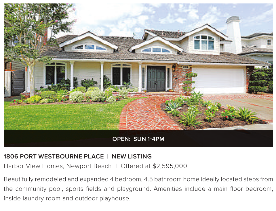OPEN: SUN 1-4PM 1806 PORT WESTBOURNE PLACE | NEW LISTING Harbor View Homes, Newport Beach | Offered at $2,595,000 Beautifully remodeled and expanded 4bedroom,4.5 bathroom home ideally located steps from the community pool, sports fields and playground. Amenities include a main floor bedroom, inside laundry room and outdoor playhouse. See also