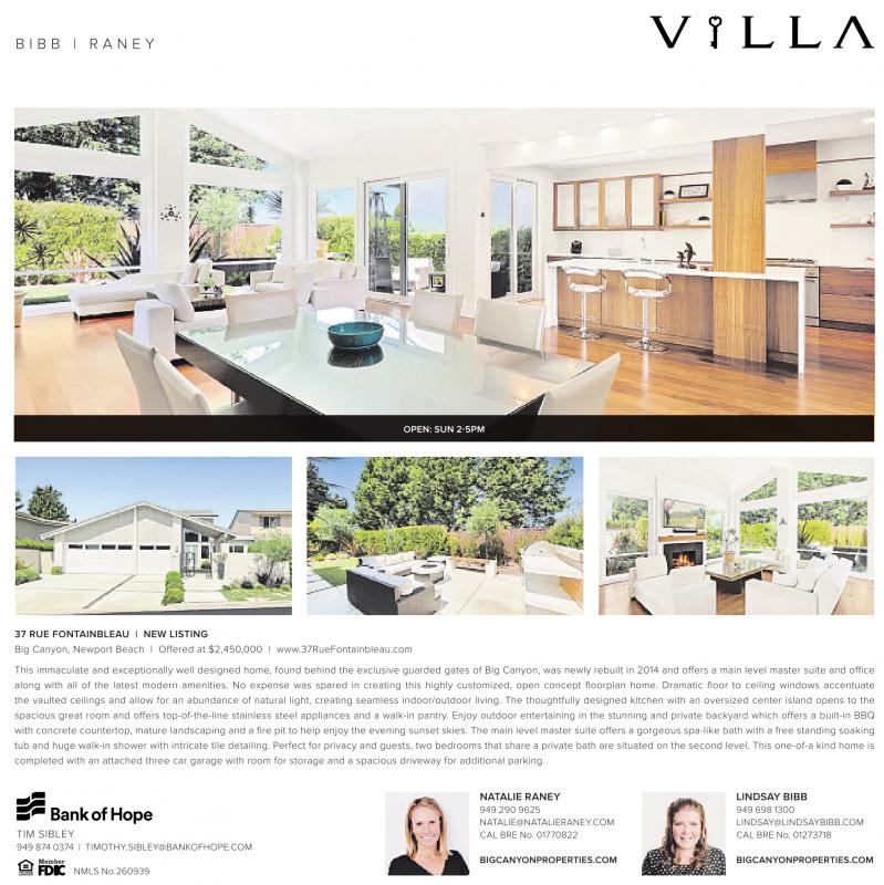 B I B B | R A N E Y OPEN: SUN 2-5PM 37 RUE FONTAINBLEAU | NEW LISTING Big Canyon, Newport Beach | Offered at $2,450,000 | www.37RueFontainbleau.com This immaculate and exceptionally well designed home, found behind the exclusive guarded gates of Big Canyon, was newly rebuilt in 2014 and offers a main level master suite and office along with all of the latest modern amenities. No expense was spared in creating this highly customized, open concept floorplan home. Dramatic floor to ceiling windows accentuate the vaulted ceilings and allow for an abundance of natural light, creating seamless indoor/outdoor living. The thoughtfully designed kitchen with an oversized center island opens to the spacious great room and offers top-of-the-line stainless steel appliances and a walk-in pantry. Enjoy outdoor entertaining in the stunning and private backyard which offers a built-in BBQ with concrete countertop, mature landscaping and a fire pit to help enjoy the evening sunset skies. The main level master suite offers a gorgeous spa-like bath with a free standing soaking tub and huge walk-in shower with intricate tile detailing. Perfect for privacy and guests, two bedrooms that share a private bath are situated on the second level. This one-of-a kind home is completed with an attached three car garage with room for storage and a spacious driveway for additional parking. TIM SIBLEY 949 874 0374 | TIMOTHY.SIBLEY@BANKOFHOPE.COM NMLS No.260939 NATALIE RANEY 949 290 9625 NATALIE@NATALIERANEY.COM CAL BRE No. 01770822 BIGCANYONPROPERTIES.COM LINDSAY BIBB 949 698 1300 LINDSAY@LINDSAYBIBB.COM CAL BRE No. 01273718 BIGCANYONPROPERTIES.COM