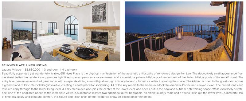 651 NYES PLACE | NEW LISTING Laguna Village | $3,850,000 | 3 bedroom | 4 bathroom Beautifully appointed yet wonderfully livable, 651 Nyes Place is the physical manifestation of the aesthetic philosophy of renowned design firm Leo. The deceptively small appearance from the street belies the residence – generous light filled spaces, panoramic ocean views, and a marvelous private hillside pool reminiscent of the Italian hillside pools of the Amalfi coast. The entry level centers on a vaulted great room, with a separate dining area with just enough intimacy to lend a formal air without isolating the space. The kitchen is open to the great room across a grand island of Calcutta Gold Baglia marble, creating a centerpiece for socializing. All of the key rooms to the home overlook the dramatic Pacific and canyon views. The muted tones and textures carry through to the lower living level. A cozy media den occupies the center of the lower level, and opens out to the pool and outdoor entertaining space. While extremely private, one side of the pool area opens to the incredible views. A sumptuous master, two additional guest bedrooms, an ample laundry room and a sauna finish out the lower level. A masterful mix of timeless luxury and creature comfort, the fixture and finish level of the residence show an exceptional refinement.