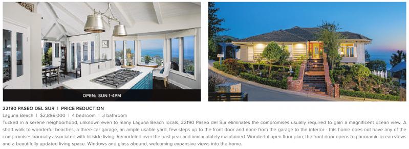 22190 PASEO DEL SUR | PRICE REDUCTION Laguna Beach | $2,899,000 | 4 bedroom | 3 bathroom Tucked in a serene neighborhood, unknown even to many Laguna Beach locals, 22190 Paseo del Sur eliminates the compromises usually required to gain a magnificent ocean view. A short walk to wonderful beaches, a three-car garage, an ample usable yard, few steps up to the front door and none from the garage to the interior - this home does not have any of the compromises normally associated with hillside living. Remodeled over the past year and immaculately maintained. Wonderful open floor plan, the front door opens to panoramic ocean views and a beautifully updated living space. Windows and glass abound, welcoming expansive views into the home.