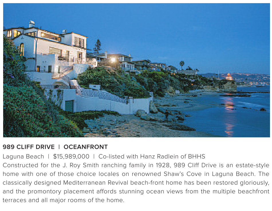 989 CLIFF DRIVE | OCEANFRONT Laguna Beach | $15,989,000 | Co-listed with Hanz Radlein of BHHS Constructed for the J. Roy Smith ranching family in 1928, 989 Cliff Drive is an estate-style home with one of those choice locales on renowned Shaw’s Cove in Laguna Beach. The classically designed Mediterranean Revival beach-front home has been restored gloriously, and the promontory placement affords stunning ocean views from the multiple beachfront terraces and all major rooms of the home.