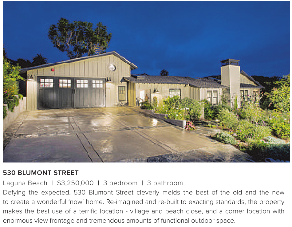 530 BLUMONT STREET Laguna Beach | $3,250,000 | 3 bedroom | 3 bathroom Defying the expected, 530 Blumont Street cleverly melds the best of the old and the new to create a wonderful ‘now’ home. Re-imagined and re-built to exacting standards, the property makes the best use of a terrific location - village and beach close, and a corner location with enormous view frontage and tremendous amounts of functional outdoor space.