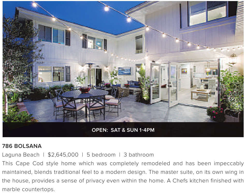 OPEN: SAT &SUN 1-4PM 786 BOLSANA Laguna Beach | $2,645,000 | 5 bedroom | 3 bathroom This Cape Cod style home which was completely remodeled and has been impeccably maintained, blends traditional feel to a modern design. The master suite, on its own wing in the house, provides a sense of privacy even within the home. A Chefs kitchen finished with marble countertops. See also