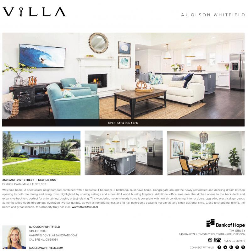 A J O L S O N W H I T F I E L D OPEN: SAT &SUN 1-4PM 259 EAST 21ST STREET | NEW LISTING Eastside Costa Mesa | $1,385,000 Welcome home! A spectacular neighborhood combined with a beautiful 4 bedroom, 3 bathroom must-have home. Congregate around the newly remodeled and dazzling dream kitchen opening to both the dining and living room highlighted by soaring ceilings and a beautiful wood burning fireplace. Additional office area near the kitchen opens to the back deck and expansive backyard perfect for entertaining, playing or just relaxing. This wonderful, move-in-ready home is complete with new air conditioning, interior doors, upgraded electrical, gorgeous authentic wood floors throughout, oversized two-car garage, as well as remodeled master and hall bathrooms boasting marble tile and clean designer style. Close to shopping, dining, the beach and great schools, this property truly has it all. www.259e21st.com AJ OLSON WHITFIELD 949 433 8989 AWHITFIELD@VILLAREALESTATE.COM CAL BRE No. 01869034 TIM SIBLEY 949 874 0374 | TIMOTHY.SIBLEY@BANKOFHOPE.COM NMLS No.260939 AJOLSONWHITFIELD.COM CONNECT WITH US