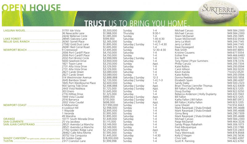 LAGUNA NIGUEL............................................... 31701 Isle Vista $5,500,000 Sunday 1-4 Michael Caruso 949.584.2300 36 Newcastle Lane $1,988,000 Thursday 9:30-1 Michael Caruso 949.584.2300 24242 Bellerive Circle $1,085,000 Sunday 1-4 Sherri McDaniel 949.293.7495 LAKE FOREST..................................................... 28945 Oakview Lane $599,900 Saturday 1:30-4:30 Susan McDonnell 949.632.0544 NELLIE GAIL RANCH ......................................... 26361 Sorrell Place $2,365,000 Sunday 1-4:30 Jerry La Mott 949.244.7145 27582 Gold Dust Lane $1,895,000 Saturday | Sunday 1-4 | 1-4:30 Jerry La Mott 949.244.7145 26081 Red Corral Road $1,695,000 Saturday 1-4 Dave Dyssegard 949.315.1206 NEWPORT BEACH ............................................. 9 Crestwood $7,495,000 Sunday 12:30-4:30 Rob Smith 949.697.8855 2006 Port Cardiff Place $4,150,000 Saturday 1-4 Kristine Cousens 949.677.5554 2006 Port Cardiff Place $4,150,000 Sunday 1-4 Esther Fine 949.466.6483 2032 Port Bristol Circle $3,999,999 Saturday | Sunday 1-4 Eric Neff 949.500.7119 5600 Seashore Drive $3,900,000 Saturday 1-4 Tony Florez | Pryor Summers 949.378.7276 1821 Toyon Lane $3,250,000 Sunday Appt. Phillip Caruso 949.293.7334 2731 Alta Vista Drive $3,129,000 Saturday 1-4 Katie Rollins 949.293.0594 2731 Alta Vista Drive $3,129,000 Sunday 1-4 Carol Allison 949.302.0220 2827 Carob Street $3,089,000 Saturday 1-4 Kevin Kanda 714.612.0529 2827 Carob Street $3,089,000 Sunday 1-4 Katie Rollins 949.293.0594 514 Westminster Avenue $2,888,888 Saturday | Sunday 12-3 Donna Peebles 949.500.1858 2645 Bamboo Street $2,720,000 Saturday | Sunday 1-4 | 1-3 Elizabeth Spain 949.280.4287 1845 Port Westbourne Place $2,600,000 Sunday 1-4 Sandy Daley 949.500.2323 900 Spring Tide Drive $2,498,888 Saturday | Sunday Appt. Brian Thomas | Jennifer Thomas 949.422.6409 2443 Vista Nobleza $1,725,000 Saturday | Sunday Appt. Bill Fallon | Kathy Fallon 949.923.1205 303 Enero $1,645,000 Sunday 1-4 Doug Dunlap 949.922.0250 2716 Hilltop Drive $1,325,000 Saturday 1-4 Rebecca Anderson | Holly Duplanty 949.433.1943 1949 Vista Caudal $990,000 Saturday | Sunday Appt. Bill Fallon 949.923.1205 2016 Barranca $735,000 Saturday | Sunday 1-4 Kathy Fallon | Bill Fallon 949.887.0972 2002 Vista Caudal $698,000 Saturday | Sunday Appt. Bill Fallon | Kathy Fallon 949.923.1205 NEWPORT COAST ............................................. 4 Midsummer $17,990,000 Sunday 1-4 Lena Ghezel 714.914.3443 4 Lookout Hill $2,998,000 Sunday 1-4 Mark Ravanpak | Shala Emdadi 949.395.4688 1 Wayside $2,895,000 Sunday 1-4 Mark Ravanpak | Shala Emdadi 949.395.4688 1 Veranda $1,995,000 Sunday 1-4 Ginny Berg 949.290.7309 49 Mandria $1,895,000 Saturday 1-4 Mark Ravanpak | Shala Emdadi 949.395.4688 ORANGE ............................................................ 10771 South Morada Drive $1,449,000 Saturday 1-4 Michael Caruso 949.584.2300 SAN CLEMENTE ................................................. 25 Via Jacobea $1,115,000 Sunday 1-4 Paige McDaniel 949.464.3226 SAN JUAN CAPISTRANO................................... 28521 Avenida La Mancha $3,149,000 Saturday 1-4 Sandy Phipps Rabahieh 949.306.1073 28521 Avenida La Mancha $3,149,000 Sunday 1-4 Fred Albuquerque 949.233.1788 27762 Golden Ridge Lane $2,250,000 Saturday Appt. Judy Minor 949.533.2403 28462 Calle Mira Monte $1,595,000 Sunday 1-4 Tracy Weintraub 949.874.8568 30752 Via Conquista $1,445,000 Saturday 1-4:30 Kelly O'Hagan 949.292.5636 SHADY CANYON ® For gate access, please call agents listed. 60 Golden Eagle $18,950,000 Sunday 1-4 Chris Valli 714.883.4397 TUSTIN ............................................................... 2317 Cranston Lane $1,999,998 Sunday 1-4 Scott R. Panning 949.422.6792