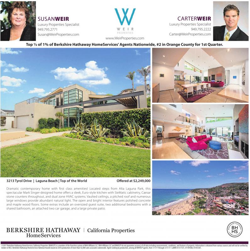 SUSANWEIR Luxury Properties Specialist 949.795.2771 Susan@WeirProperties.com www.WeirProperties.com CARTERWEIR Luxury Properties Specialist 949.795.2222 Carter@WeirProperties.com Top ½ of 1% of Berkshire Hathaway HomeServices’Agents Nationwide, #2 in Orange County for 1st Quarter. 3213 Tyrol Drive | Laguna Beach |Top of the World Offered at $2,249,000 Dramatic contemporary home with first class amenities! Located steps from Alta Laguna Park, this spectacular Mark Singer-designed home offers a sleek, Euro-style kitchen with SieMatic cabinetry, Caesar stone counters throughout, and dual zone HVAC systems. Vaulted ceilings, a pitched roof and numerous large windows provide abundant natural light. The open and bright interior features polished concrete and maple wood floors. Some extras include an oversized guest suite, two additional bedrooms with a shared bathroom, an attached two car garage, and a large private patio. ©2017 BerkshireHathaway HomeServices California Properties (BHHSCP)isamember of the franchise system of BHH AffiliatesLLC.BHH AffiliatesLLC and BHHSCP do not guaranteeaccuracyofall data including measurements,conditions,and features of property.Information is obtained from varioussources and will not be verified by broker or MLS. BerkshireHathaway HomeServices National Awards based on 2016 production of morethan 42,000 sales associatesnationwide.Agentranking by production, among all BHHSCP agents,from1/1/17through 3/31/17. CalBRE 01317331, 01109388, 01455381.