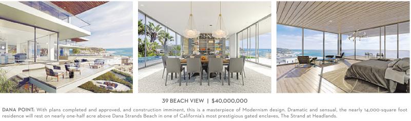 39 BEACH VIEW | $40,000,000 DANA POINT: With plans completed and approved, and construction imminent, this is a masterpiece of Modernism design. Dramatic and sensual, the nearly 14,000-square foot residence will rest on nearly one-half acre above Dana Strands Beach in one of California’s most prestigious gated enclaves, The Strand at Headlands.