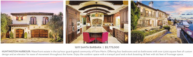 HUNTINGTON HARBOUR: Waterfront estate in the 24-hour guard-gated community of Faire Marin. Offering four bedrooms and six bathrooms with over 5,100 square feet of custom design and an elevator for ease of movement throughout the home. Enjoy the outdoor space with a tranquil pool and a dock boasting 78 feet with 90 feet of frontage space.