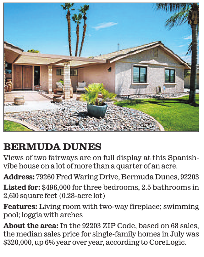 BERMUDA DUNES Views of two fairways are on full display at this Spanishvibe house on a lot of more than a quarter of an acre. Address: 79260 Fred Waring Drive, Bermuda Dunes, 92203 Listed for: $496,000 for three bedrooms, 2.5 bathrooms in 2,610 square feet (0.28-acre lot) Features: Living room with two-way fireplace; swimming pool; loggia with arches About the area: In the 92203 ZIP Code, based on 68 sales, the median sales price for single-family homes in July was $320,000, up 6% year over year, according to CoreLogic. See also