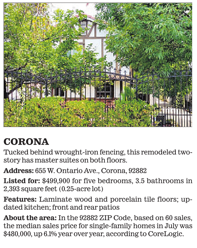 CORONA Tucked behind wrought-iron fencing, this remodeled twostory has master suites on both floors. Address: 655 W. Ontario Ave., Corona, 92882 Listed for: $499,900 for five bedrooms, 3.5 bathrooms in 2,393 square feet (0.25-acre lot) Features: Laminate wood and porcelain tile floors; updated kitchen; front and rear patios About the area: In the 92882 ZIP Code, based on 60 sales, the median sales price for single-family homes in July was $480,000, up 6.1% year over year, according to CoreLogic. See also