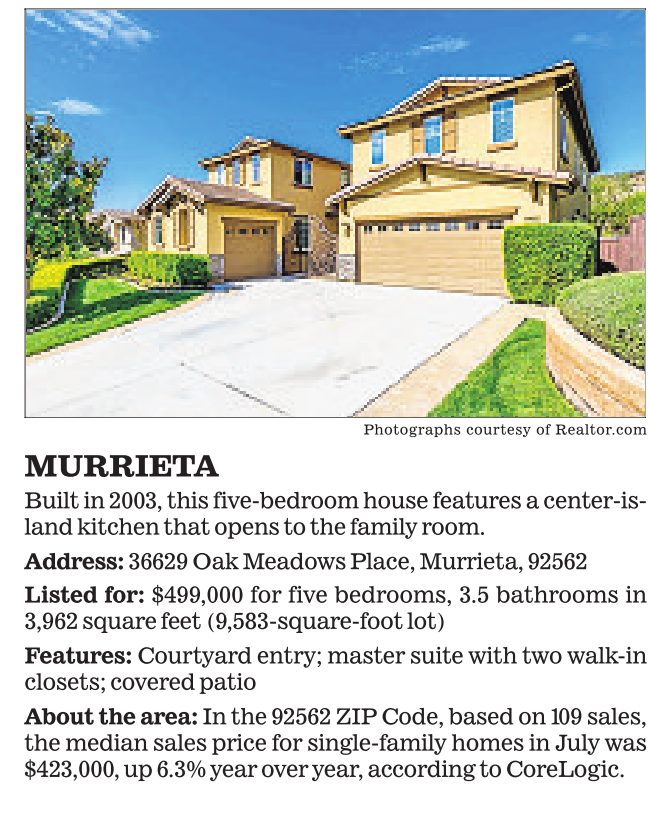 About the area: In the 92562 ZIP Code, based on 109 sales, the median sales price for single-family homes in July was $423,000, up 6.3% year over year, according to CoreLogic.
