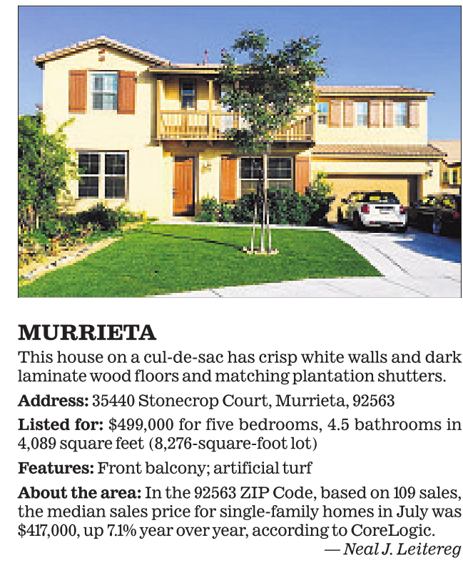 MURRIETA This house on a cul-de-sac has crisp white walls and dark laminate wood floors and matching plantation shutters. Address: 35440 Stonecrop Court, Murrieta, 92563 Listed for: $499,000 for five bedrooms, 4.5 bathrooms in 4,089 square feet (8,276-square-foot lot) Features: Front balcony; artificial turf About the area: In the 92563 ZIP Code, based on 109 sales, the median sales price for single-family homes in July was $417,000, up 7.1% year over year, according to CoreLogic. —Neal J. Leitereg See also
