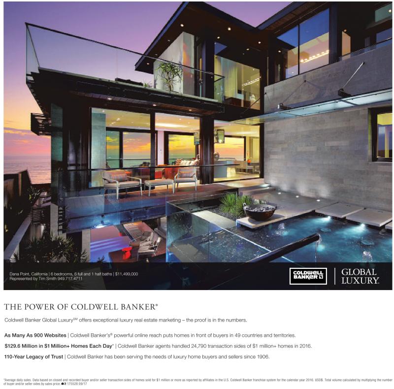 Dana Point, California |6bedrooms, 6full and 1half baths |$11,499,000 Represented by Tim Smith 949.717.4711 THE POWER OF COLDWELL BANKER® Coldwell Banker Global Luxury SM offers exceptional luxury real estate marketing – the proof is in the numbers. As Many As 900 Websites | Coldwell Banker’s ® powerful online reach puts homes in front of buyers in 49 countries and territories. $129.6 Million in $1Million+ Homes Each Day* | Coldwell Banker agents handled 24,790 transaction sides of $1 million+ homes in 2016. 110-Year Legacy of Trust | Coldwell Banker has been serving the needs of luxury home buyers and sellers since 1906. *Average daily sales. Data based on closed and recorded buyer and/or seller transaction sides of homes sold for $1 million or more asreported byaffiliates inthe U.S. Coldwell Banker franchise system for the calendar year 2016. USD$. Total volume calculated bymultiplying the number of buyer and/or seller sides by sales price. 175528 09/17