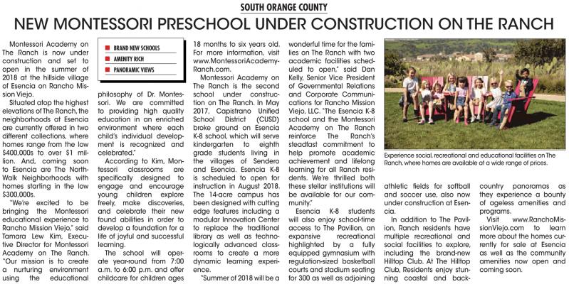 wonderful time for the families on The Ranch with two academic facilities scheduled to open,” said Dan Kelly, Senior Vice President of Governmental Relations and Corporate Communications for Rancho Mission Viejo, LLC.“The Esencia K-8 school and the Montessori Academy on The Ranch reinforce The Ranch’s steadfast commitment to help promote academic achievement and lifelong learning for all Ranch residents. We’re thrilled both these stellar institutions will be available for our community.”