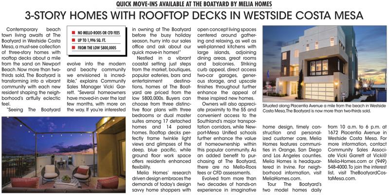 from 10 a.m. to 6 p.m. at 1672 Placentia Avenue in Westside Costa Mesa. For more information, contact Community Sales Associate Vicki Garrett at Vicki@ Melia-Homes.com or (949) 548-4000.To join the interest list, visit TheBoatyardCostaMesa.com.