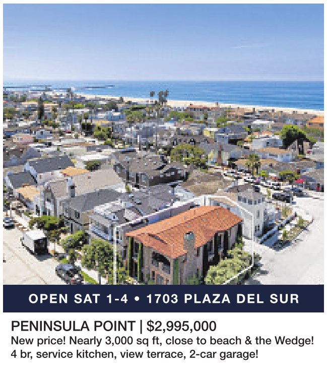 PENINSULA POINT | $2,995,000 New price! Nearly 3,000 sq ft, close to beach & the Wedge! 4 br, service kitchen, view terrace, 2-car garage!