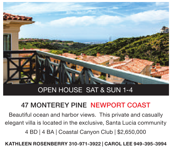 OPEN HOUSE SAT & SUN 1-4 47 MONTEREY PINE NEWPORT COAST Beautiful ocean and harbor views. This private and casually elegant villa islocated inthe exclusive, Santa Lucia community 4BD|4BA |Coastal Canyon Club |$2,650,000 KATHLEEN ROSENBERRY 310-971-3922 |CAROL LEE 949-395-3994