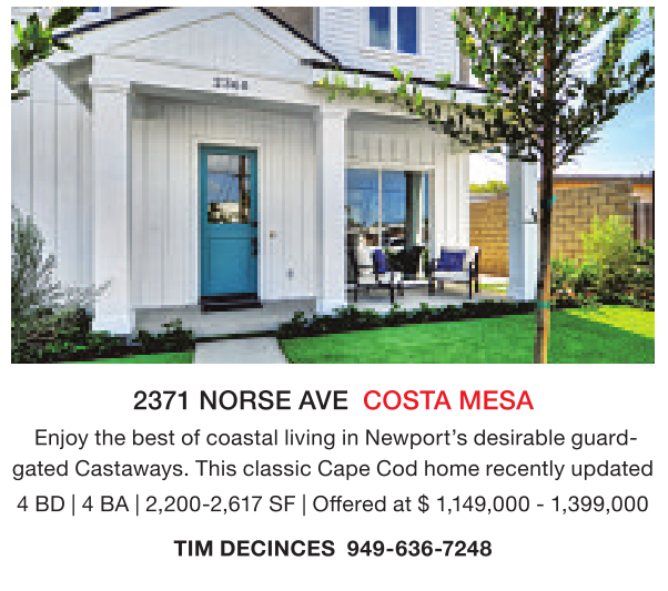 2371 NORSE AVE COSTA MESA Enjoy the best ofcoastal living inNewport’s desirable guardgated Castaways. This classic Cape Cod home recently updated 4BD|4BA |2,200-2,617 SF |Offered at $1,149,000 -1,399,000