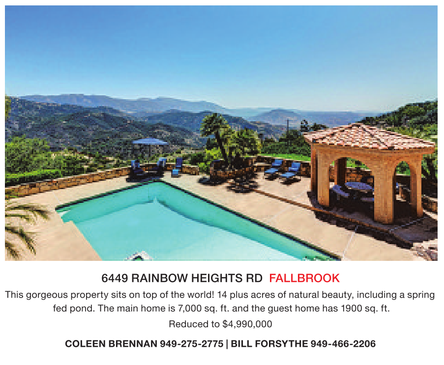 6449 RAINBOW HEIGHTS RD FALLBROOK This gorgeous property sits on top ofthe world! 14 plus acres of natural beauty, including aspring fed pond. The main home is 7,000 sq. ft. and the guest home has 1900 sq. ft. Reduced to$4,990,000 COLEEN BRENNAN 949-275-2775 |BILL FORSYTHE 949-466-2206