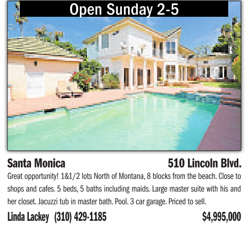 Open Sunday 2-5 Santa Monica 510Lincoln Blvd. Greatopportunity! 1&1/2 lotsNorth of Montana, 8blocksfrom the beach. Close to shops and cafes. 5beds, 5baths including maids. Largemaster suite withhis and hercloset. Jacuzzitub in master bath. Pool. 3car garage. Priced to sell. Linda Lackey (310) 429-1185 $4,995,000