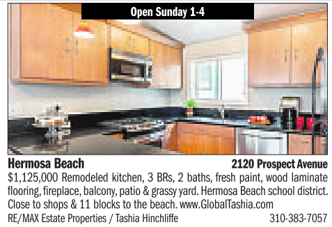 Open Sunday 1-4 Hermosa Beach 2120 Prospect Avenue $1,125,000 Remodeled kitchen, 3BRs, 2baths, fresh paint, wood laminate flooring,fireplace,balcony,patio &grassy yard.Hermosa Beach school district. Close to shops &11blocks to the beach. www.GlobalTashia.com RE/MAXEstate Properties /Tashia Hinchliffe 310-383-7057