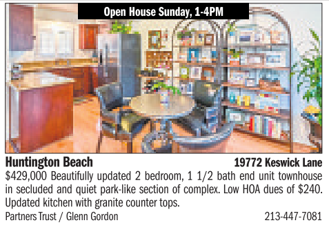 Open House Sunday,1-4PM Huntington Beach 19772Keswick Lane $429,000 Beautifully updated 2bedroom, 11/2 bath end unit townhouse in secluded and quiet park-like section of complex. Low HOA dues of $240. Updated kitchen with granite counter tops. Partners Trust /Glenn Gordon 213-447-7081