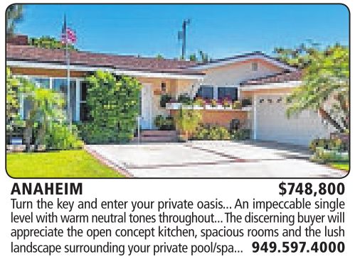 ANAHEIM $748,800 Turn the keyand enter your private oasis... An impeccable single level with warm neutral tones throughout...Thediscerning buyer will appreciate the open concept kitchen, spaciousrooms and the lush landscape surrounding your private pool/spa... 949.597.4000