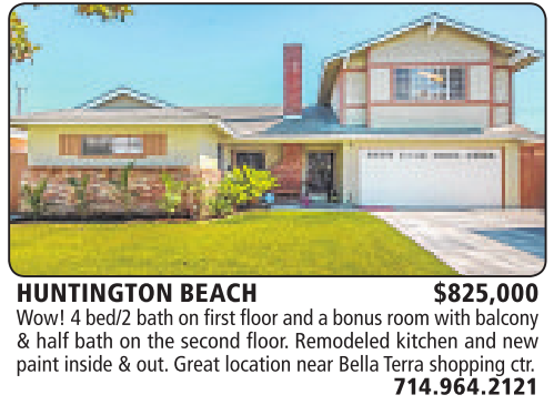HUNTINGTON BEACH $825,000 Wow! 4bed/2 bath on first floor and abonus room with balcony &half bath on the second floor.Remodeled kitchen and new paint inside &out. Great location near Bella Terra shopping ctr.
