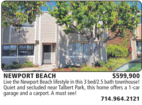 NEWPORT BEACH $599,900 Live the Newport Beach lifestyle in this 3bed/2.5 bath townhouse! Quiet and secluded near Talbert Park, this home offers a1-car garage and acarport. Amust see!