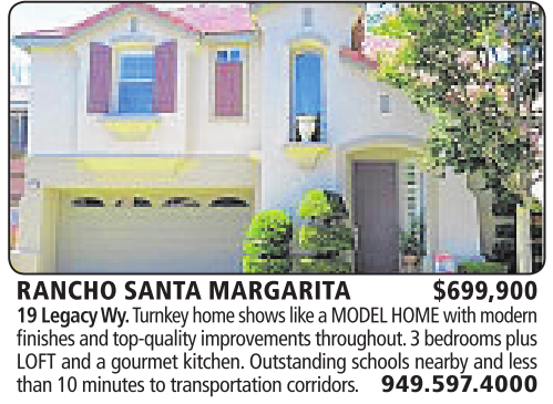 RANCHO SANTA MARGARITA $699,900 19 Legacy Wy. Turnkey home shows likeaMODELHOME with modern finishes and top-quality improvements throughout.3bedrooms plus LOFT and agourmet kitchen. Outstanding schools nearby and less than 10 minutes to transportation corridors. 949.597.4000