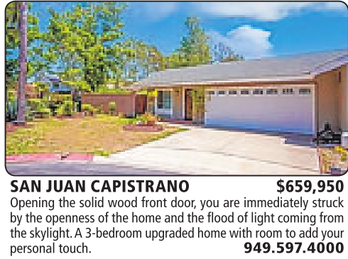 SAN JUAN CAPISTRANO $659,950 Opening the solid wood front door,you are immediately struck by the openness of the home and the flood of light coming from theskylight.A3-bedroom upgraded homewith room to add your personal touch. 949.597.4000