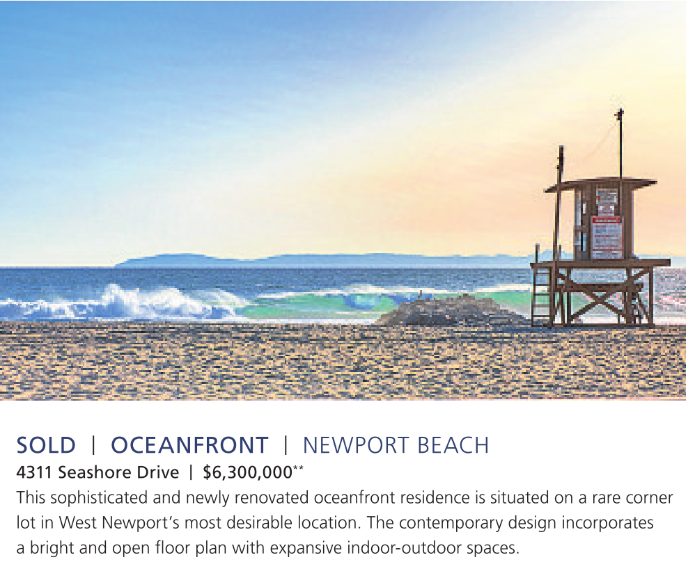 SOLD | OCEANFRONT | NEWPORT BEACH 4311 Seashore Drive | $6,300,000 ** This sophisticated and newly renovated oceanfront residence is situated on a rare corner lot in West Newport’s most desirable location. The contemporary design incorporates a bright and open floor plan with expansive indoor-outdoor spaces.